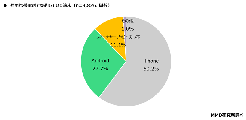 国内の状況について、例えばMMD研究所による「2025年法人向け携帯電話の利用実態調査」の結果を見てみると、以下のグラフのように、iPhoneが6割程度、残りがAndroid(ガラホも含む)やフィーチャーフォンとなっています。どちらかにシェアが偏ることなく、ほぼ拮抗している状態なので、幅広い利用者層にWebアプリケーションを使ってもらおうと思うと、双方で同等の機能、同等の操作性をサポートするように気を付ける必要があります。