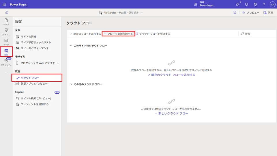 Power Pagesに統合するためのクラウドフローを実装する場合には、 Power Automate ホームページ(make.powerautomate.com)ではなく、Power Pages(make.powerpages.microsoft.com)のデザインスタジオ(設計スタジオ)から作りはじめます。