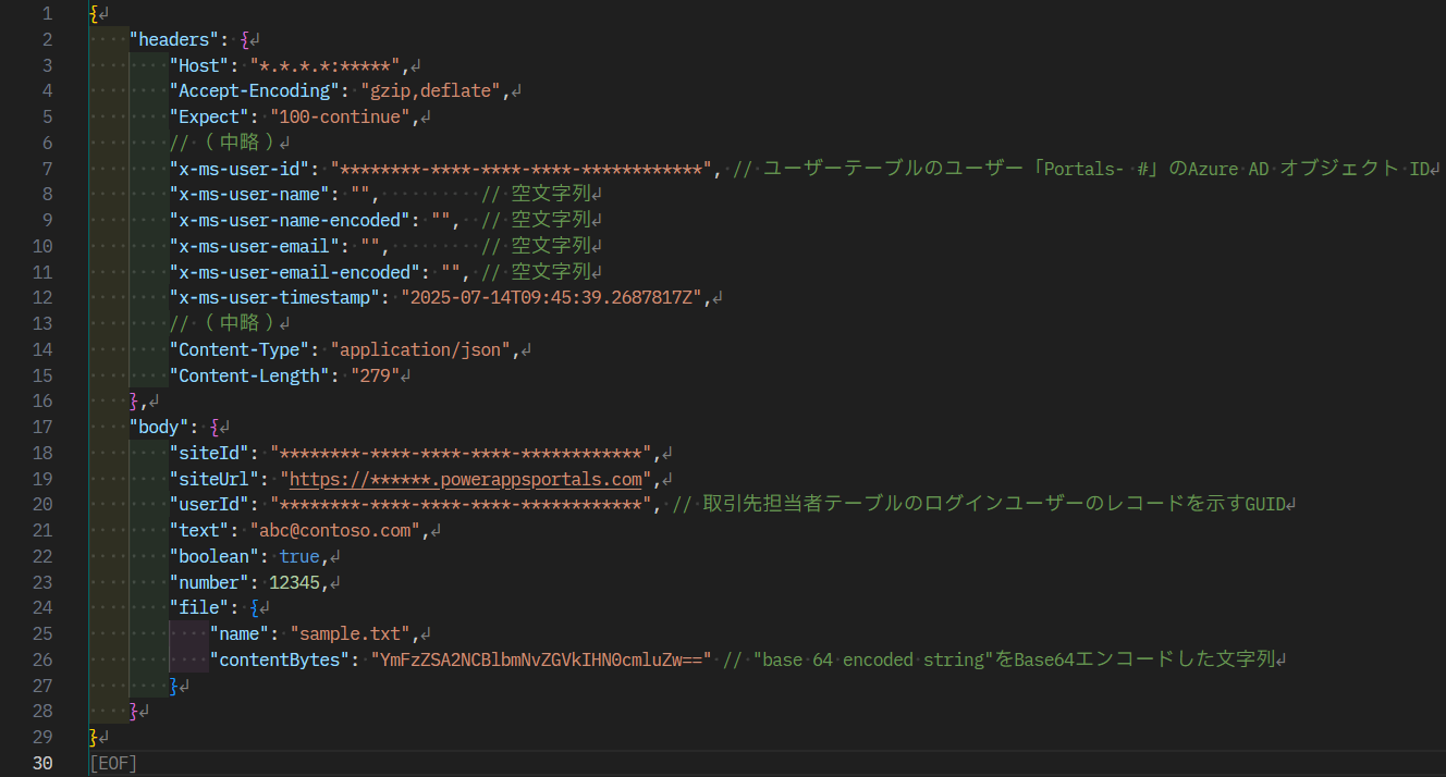 上のようにトリガーとアクションを設定したフローを試しに実行してみると、「Power Pages がフローを呼び出すタイミング」トリガーでは以下のようなデータが取得されることを確認できます。この図から、クラウドフローを実行しているのが「Portals-<サイト名> #」ユーザーであること、Power PagesサイトにログインしているユーザーのIDは、userIdプロパティとして、取引先担当者のレコードのGUIDが格納されていること、の2点を確認することができます。