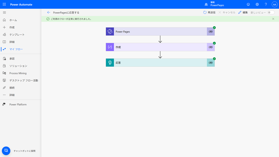 Power Automateホームページでは、一般的なクラウドフローと同様に実行履歴から、正常に実行完了しているか確認できます。