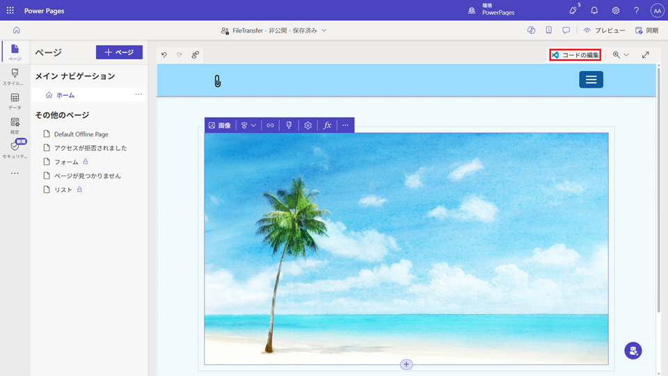 クラウドフローを呼び出す側となる、Power Pagesサイトの設定を行っていきます。今回は、ページに配置した画像をクリックするとクラウドフローが呼び出されるようにしたいと思います。画像でなくても、クリックイベントが設定できる要素であれば問題ありません。以下の実装は、Power Pagesのデザインスタジオで「コードの編集」をクリックすることによって、Visual Studio Code for the Webを開いて行います。